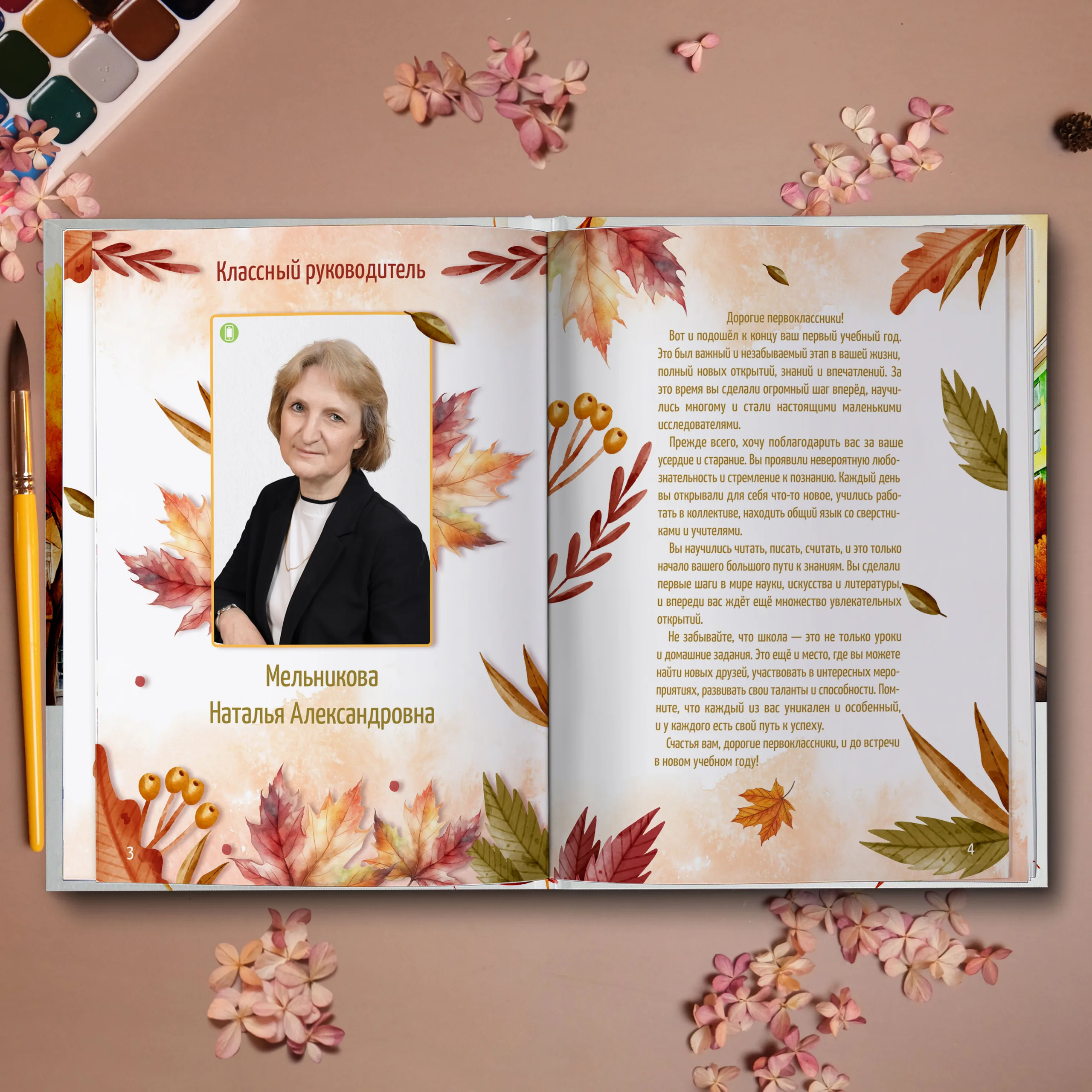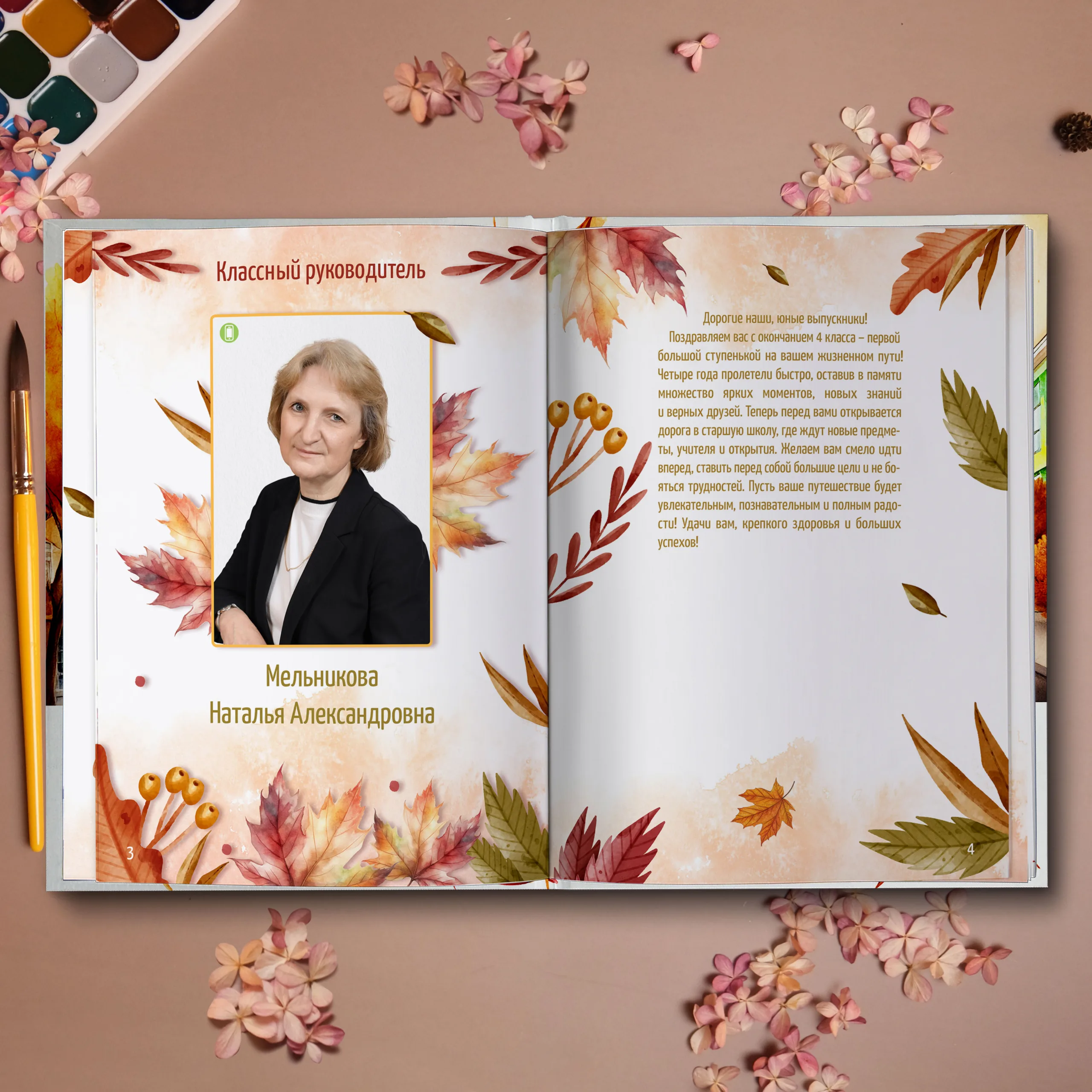 3ий разворот и далее — личные страницы учеников (портретная фотография, информация об ученике и 2 фотографии личного репортажа)