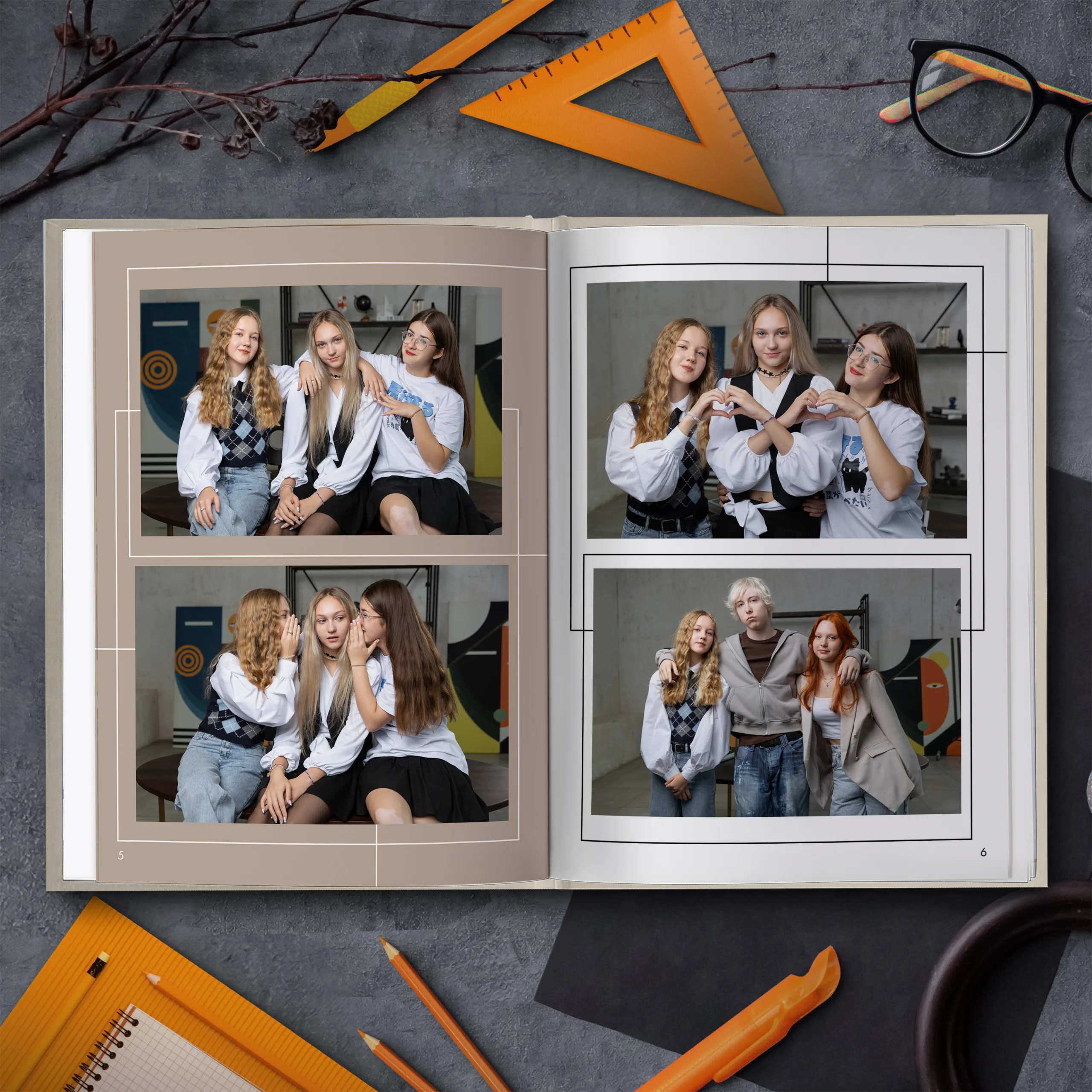 Развороты с виньетками учеников по 4-6 фото на разворот
